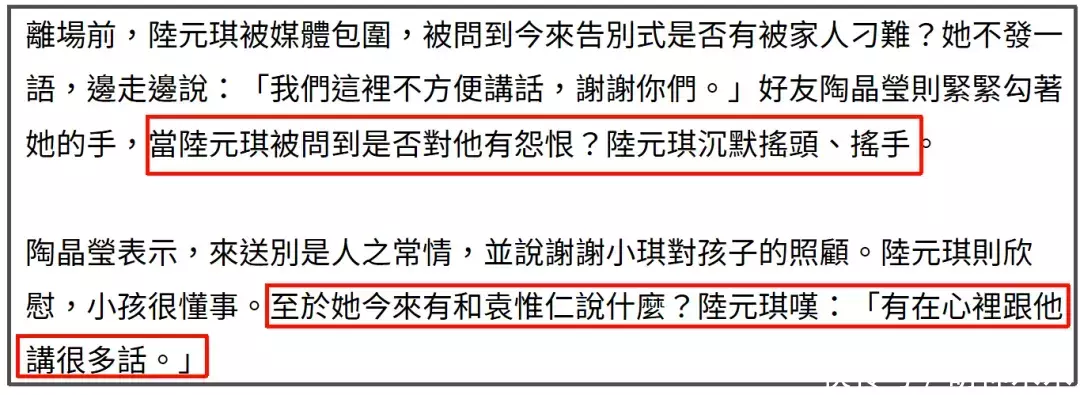 离场前陆元琪被台媒包围,被问到是否被家人刁难,陆元琪边走边说这里不方便讲话,似乎不想在告别式的场合讲家族矛盾。不过在被问到是否对袁惟仁有怨恨,陆元琪沉默摇头、挥手。似乎一切恩怨随着袁惟仁的离世,也都已经放下了。