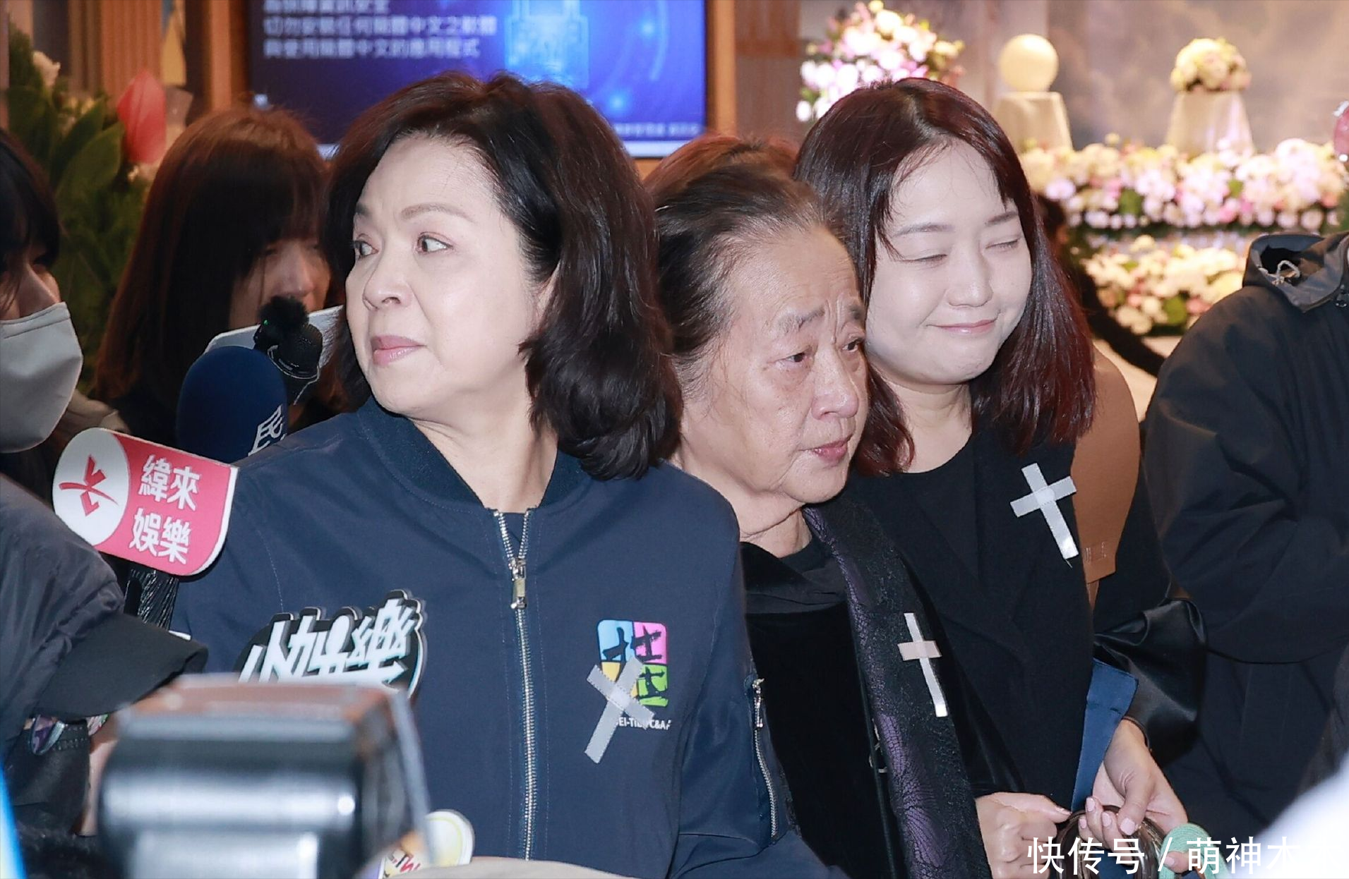 SHE也集体送上花篮,Ella一身黑衣低调现身送别恩师,离开仪式时已经哭红双眼,面对台媒采访更是哽咽到说不清楚话。