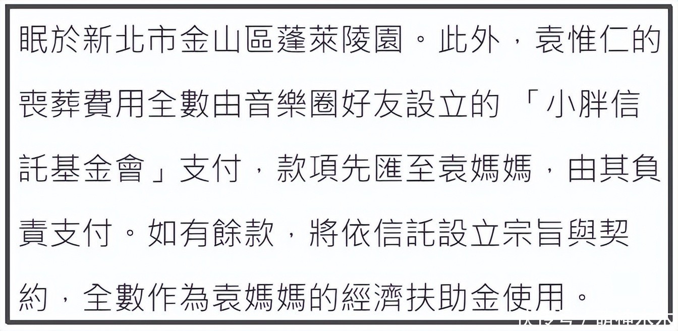 据悉,这次袁惟仁丧葬的费用,全都由音乐圈好友为袁惟仁设立的“小胖信托基金会”支付,款项直接汇给袁惟仁母亲,如果有剩余,则全数作为袁惟仁母亲的经济扶助金,也算是袁惟仁这群朋友们给他妈妈养老了。