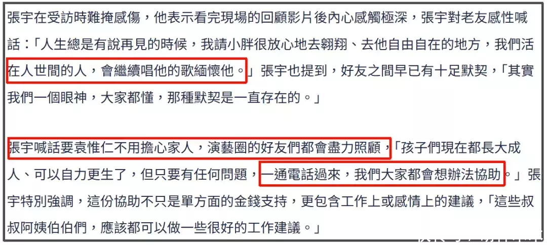 张宇接受采访时也表示,大家会继续唱袁惟仁的歌来缅怀他。也不用担心家人,演艺圈的朋友们会尽力照顾,尤其提到袁惟仁的两个孩子,直言“一通电话过来,大家都会想办法协助”,无论是金钱还是工作或是情感建议,看得出来,张宇真的把好友的孩子当成自己家人照顾。